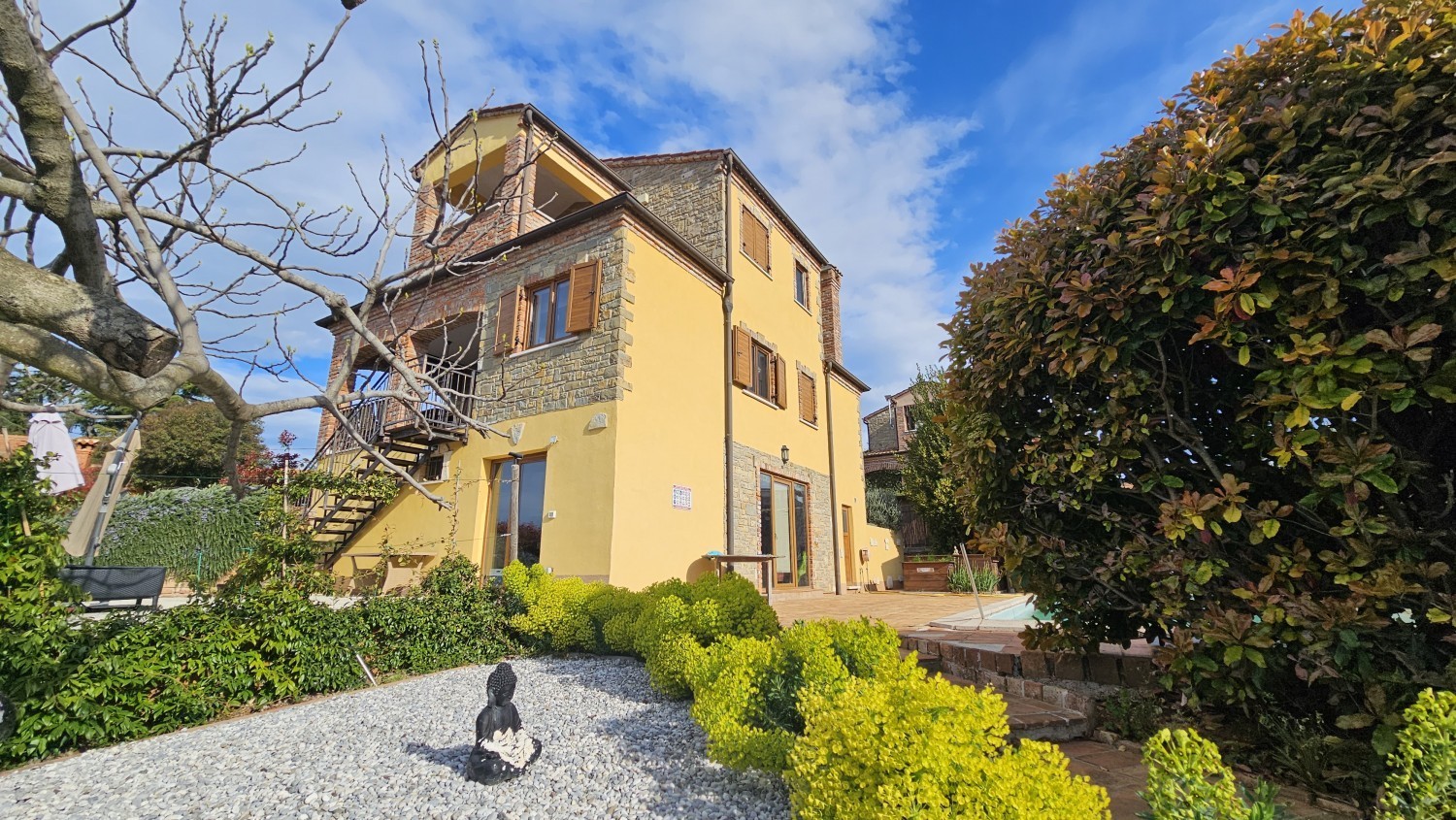 Der gepflegte Garten verfügt über einen Pool, einen Entspannungsbereich sowie private Parkplätze. Die Terrasse und die Loggia bieten einen schönen Blick auf das Meer und die umliegende Natur.