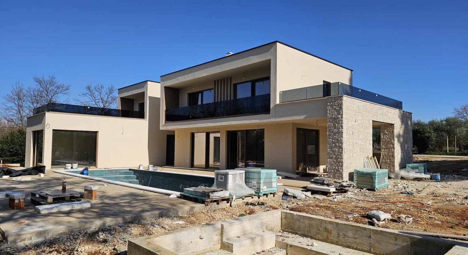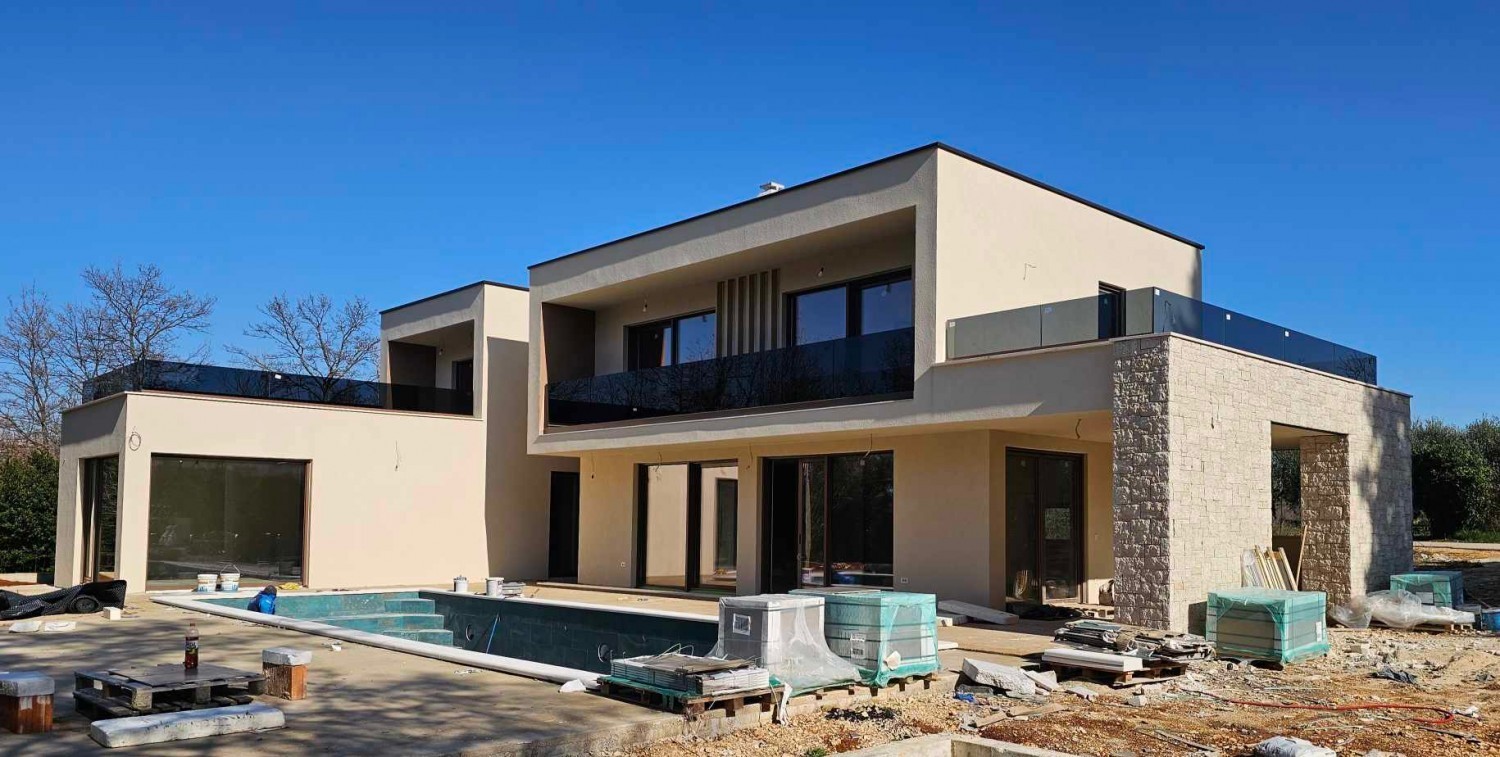 Prekrasna moderna vila cca 12 km od Poreča i 9 km od mora, na mirnoj lokaciji- Prizemlje: hodnik, dnevni boravak s blagovaonicom i kuhinjom, spavaća soba s kupaonicom, wellness soba sa teretanom i saunom, tehnička soba i wc- kat: tri spavaće sobe i 3 kupaonice- u prizemlju se nalazi prostrana natkrivena terasa i grijani bazen od 48 m2 (pločice)- Grijanje: električno podno grijanje i klima uređaji.