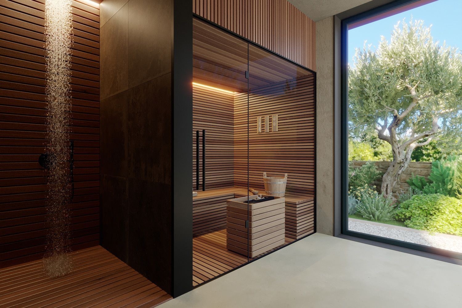 Ob vstopu v pritličje začutimo prostornost in odprtost prostora. Dnevna soba, kuhinja in jedilnica se povezujejo v harmonično celoto, preplavljeno z naravno svetlobo skozi velike steklene stene s pogledom na bazen in vrt. Na tem nivoju so še wellness prostor s finsko savno, stranišče za goste, pralnica in tehnični prostor.