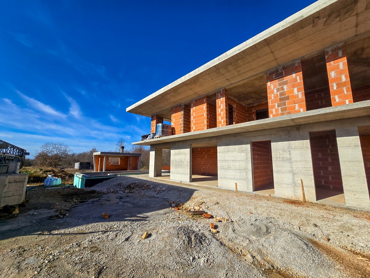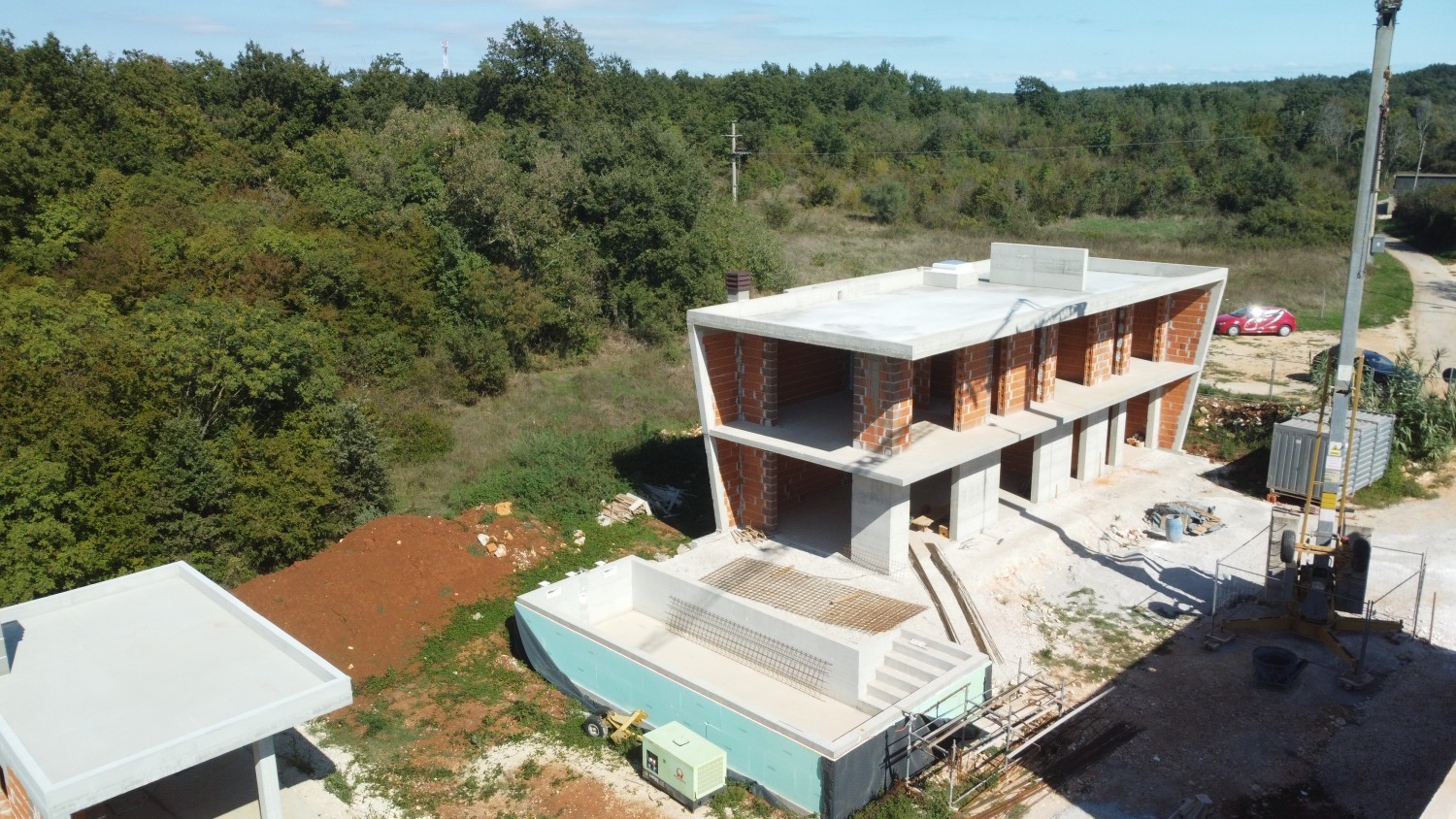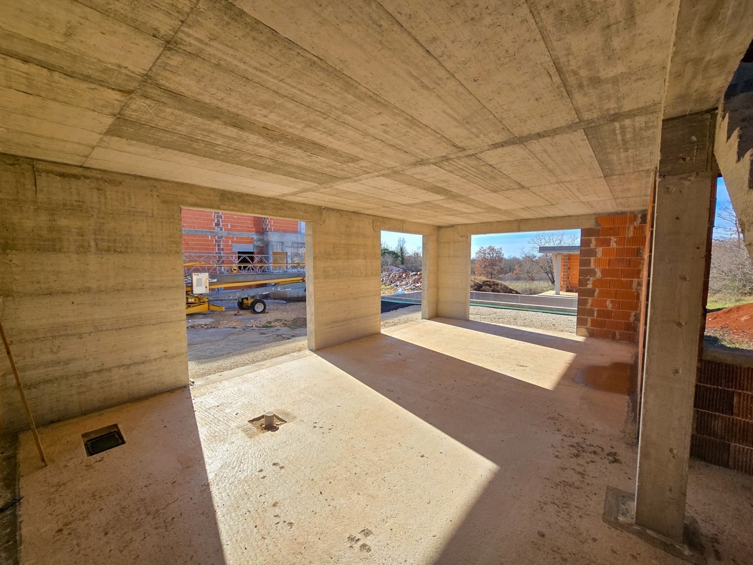 POREČ- Pribl. 10 minut vožnje od morja in centra Poreča - vila modernega dizajna v gradnji na parceli 1080 m2 - Znotraj ograjenega dvorišča bo vila imela bazen 36,30 m2 in letno kuhinjo 23,88 m2, ki je povezana z zunanjo shrambo 4,91m2. Ta moderna vila ponuja 179,61 m2 neto bivalne površine, zasnovana je v dveh etažah: pritličje in prvo nadstropje. Glavni vhod je na severni fasadi, kjer pokriti prehod vodi na hodnik, ki povezuje spalnico s pripadajočo kopalnico, straniščem za goste in vodi v odprt prostor, ki ga sestavljajo kuhinja, jedilnica in prostorna dnevna soba. Iz jedilnice/dnevne sobe je možen izhod na delno pokrito teraso. Notranje stopnišče vodi do prostorov, ki se nahajajo v prvem nadstropju, treh spalnic s pripadajočimi kopalnicami, iz vsake sobe pa je možen izhod na balkon, ki ponuja razgled na okolico.